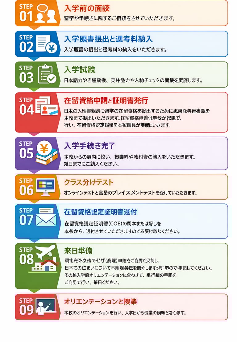 日本語能力の証明が必要で、通常はJLPT、NAT、J-Testなどの言語試験で示します。また、日本語学習150時間の修了証も必要です。